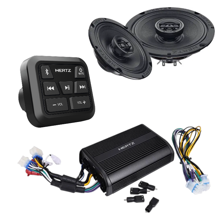 • Hertz HMR BT (Kontrol Ünitesi): Akıllı telefonunuzu Bluetooth üzerinden bağlamanızı sağlayan, IP67 sertifikalı, ultra kompakt bir kontrol merkezidir. Su sıçramalarına ve toza tam dayanıklı yapısıyla müzik akışını parmağınızın ucuna taşır.