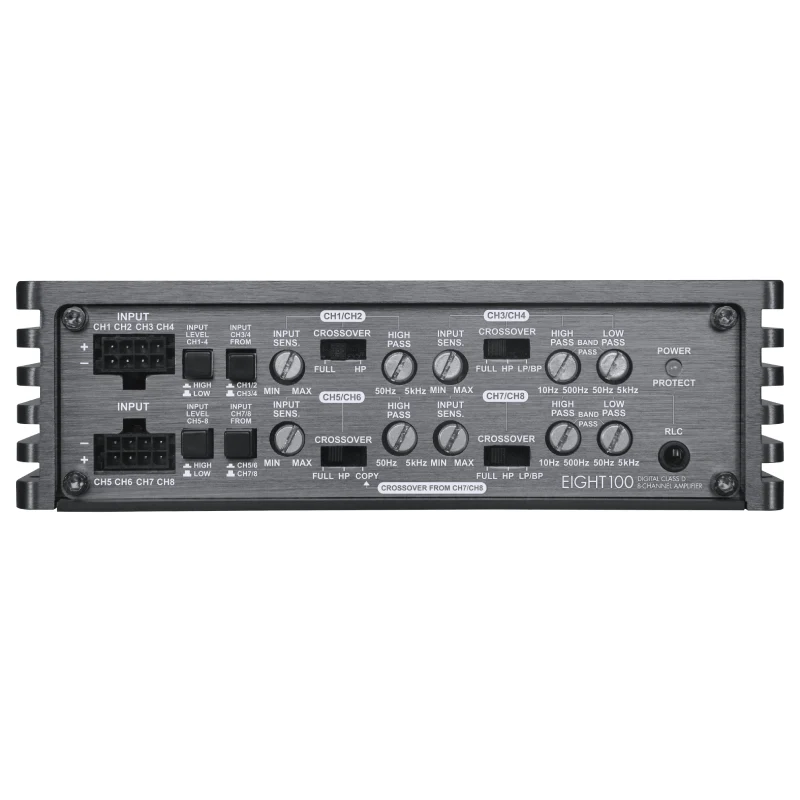 Musway EIGHT 100, çok yollu (aktif) veya çok bölgeli sistemlerde sekiz kanallı Sınıf D gücü kompakt kasada sunar. High-Level (OEM hoparlör seviyesi) ve RCA low-level girişleriyle orijinal teyp ve aftermarket ünitelerle hızlı entegrasyon sağlar.